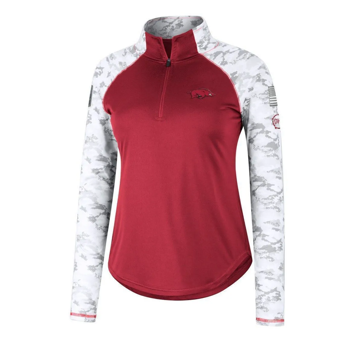 - Offer your full support to our military members while also emphasizing your Arkansas Razorbacks fandom with this OHT Flash quarter-zip jacket from Colosseum. The main body is comprised of authentic team colors while the sleeves feature a vibrant arctic camo design, which is separated by contrast-color stitching. The raglan sleeves and mock neck work together to make this patriotic top the most comfortable option for representing the Arkansas Razorbacks.